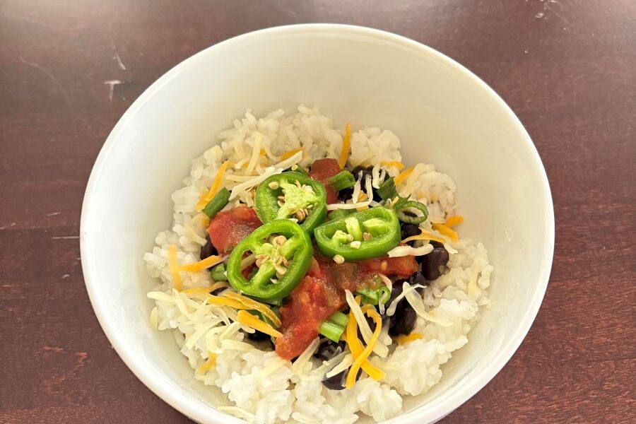 4. Once the rice is cooked, build the bowls. Add one cup cooked rice, 1/2 cup warm black beans, 1/3 cup salsa, and 1 oz. shredded cheese (about 1/4 cup) to each bowl. Top with a few sliced green onions and jalapeños, then serve.