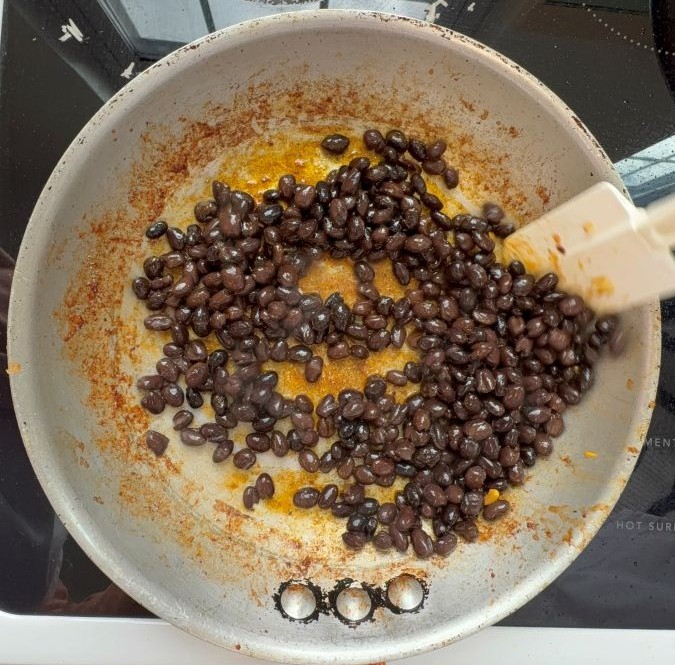 Add remaining tablespoon of olive oil to skillet and taco seasoning. Cook over medium, stirring constantly, until spices are toasted and fragrant, about 30 seconds. Add the black beans and season with salt and pepper. Cook, stirring occasionally, until the beans are warm, about 2 minutes. Remove from the heat.