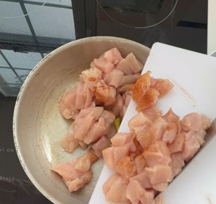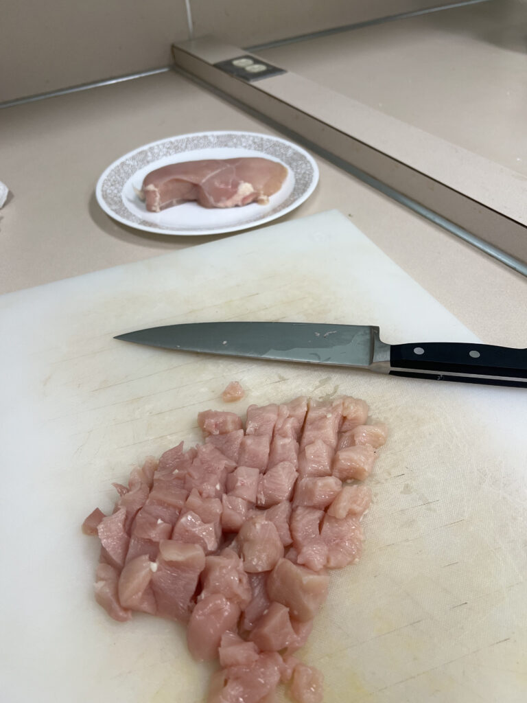 Next, prepare the chicken. Start by cutting off any fatty parts, and slice the breast lengthwise into 1/2 inch strips. Then cut the strips into 1/2 inch cubes.