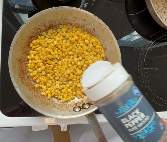 5. Return the skillet to medium and add the corn. Cook corn, tossing occasionally until warmed through, about 2 minutes. Season with salt and pepper. Scrape onto a plate.
