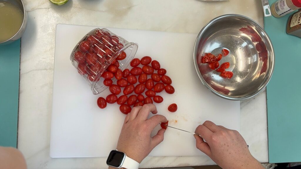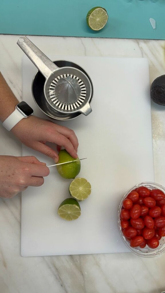 First, start by making the cilantro lime rice. You can use a rice cooker or a medium saucepan. To use the saucepan, add 1 3/4 cup of water, 1/2 tsp salt, and 1 1/2 cups of basmati rice. Bring to a boil. Then cover and reduce the heat to medium-low. Let that simmer until all the water is absorbed and the rice is tender, usually about 17 minutes. After starting the rice, you can chop the limes, avocados and tomatoes and store them somewhere cold to top the bowl at the end.