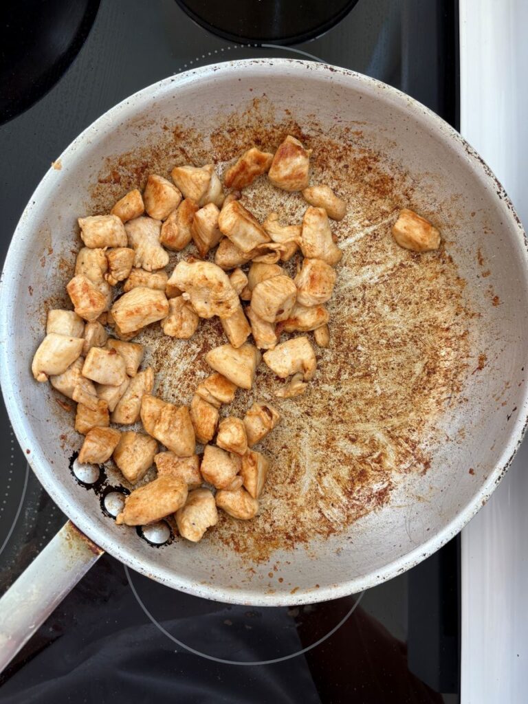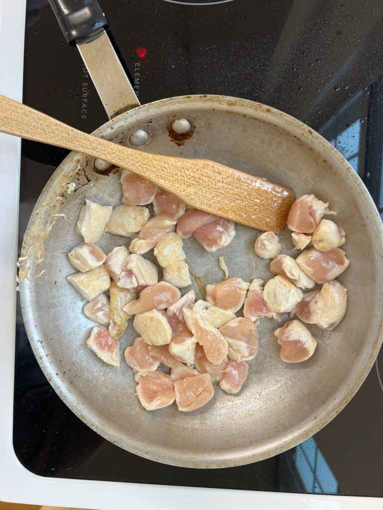 3. Add your chicken, tossing occasionally until it’s golden brown and cooked through. Cooking the chicken will last about 8 minutes, making sure to reach an internal temperature of at least 165 degrees Fahrenheit.