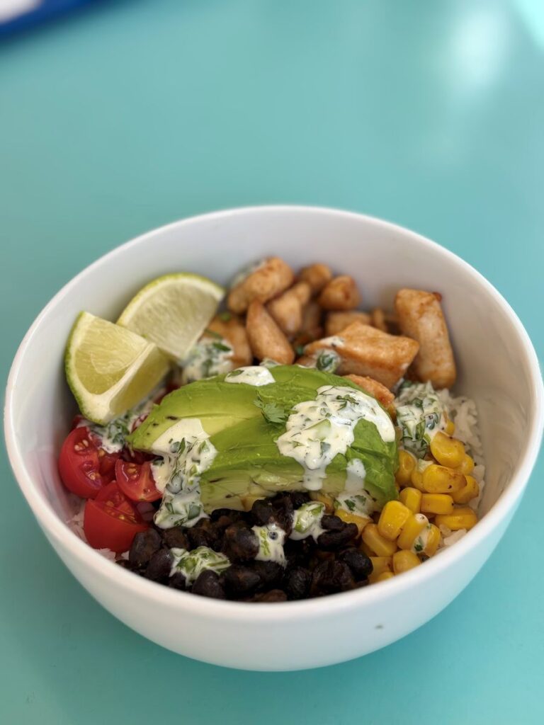 7. Fill a shallow bowl with rice. Top with corn, black beans, tomatoes, avocado, and chicken. Drizzle each bowl with aioli and garnish with cilantro.