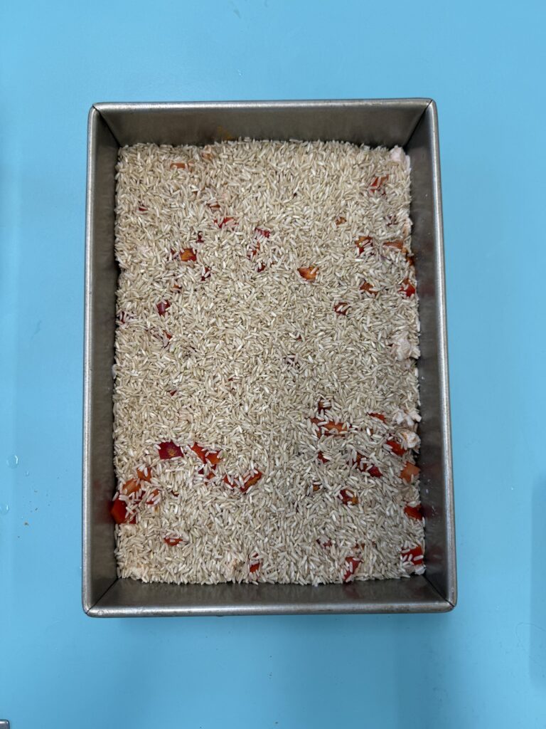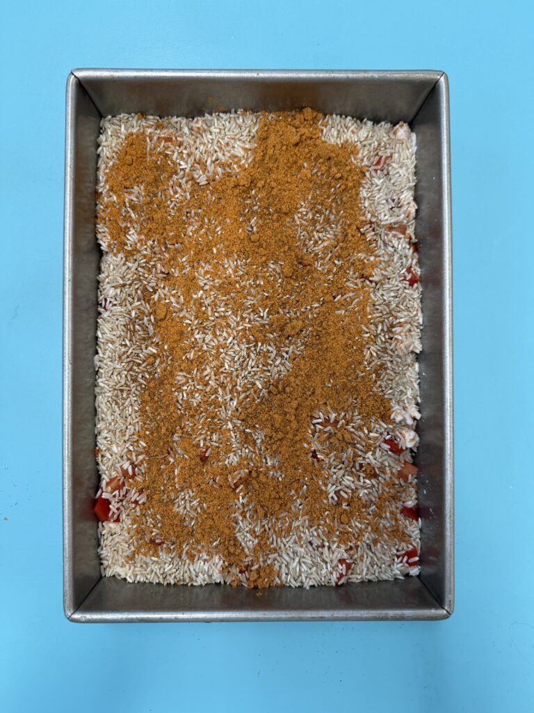 • For faster baking time: cook the rice partially or fully before adding to the pan.