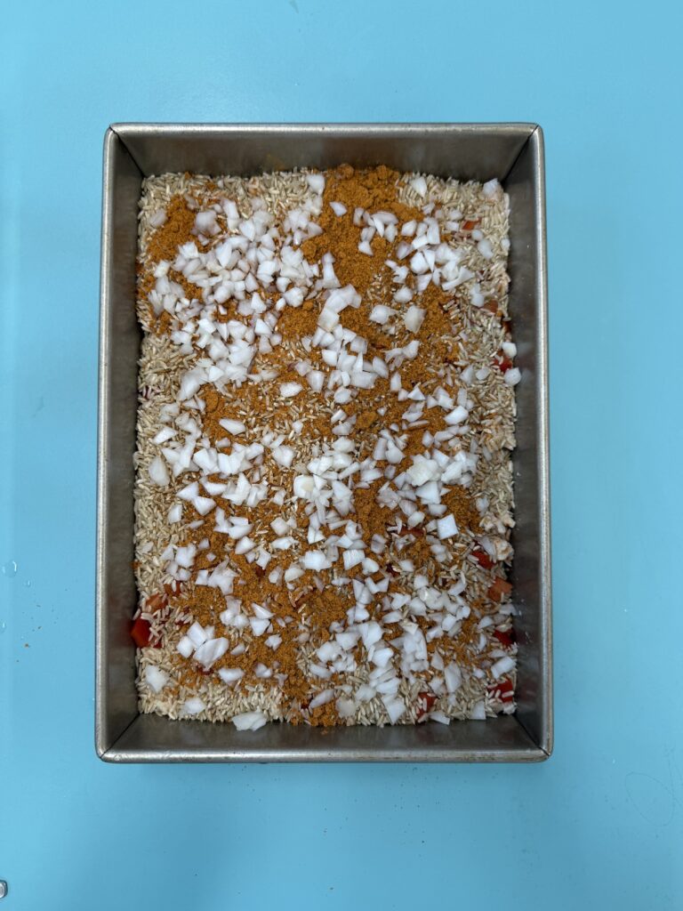 3. Add onion, bell pepper, uncooked rice, fajita seasoning, cayenne (if using), shredded chicken, black beans, and corn to the baking dish.