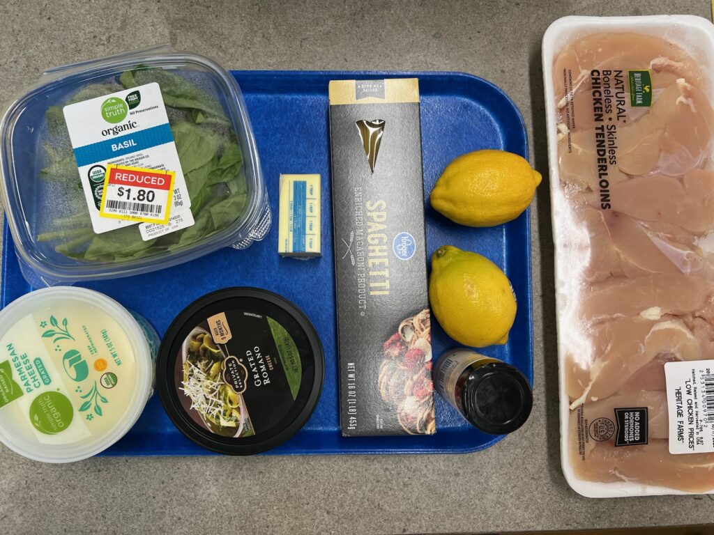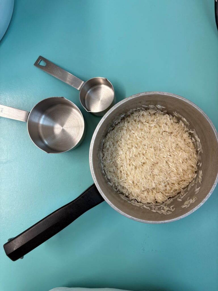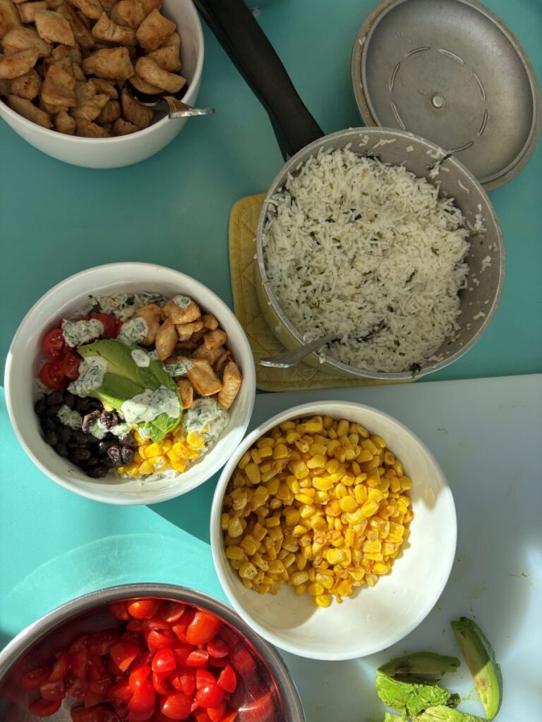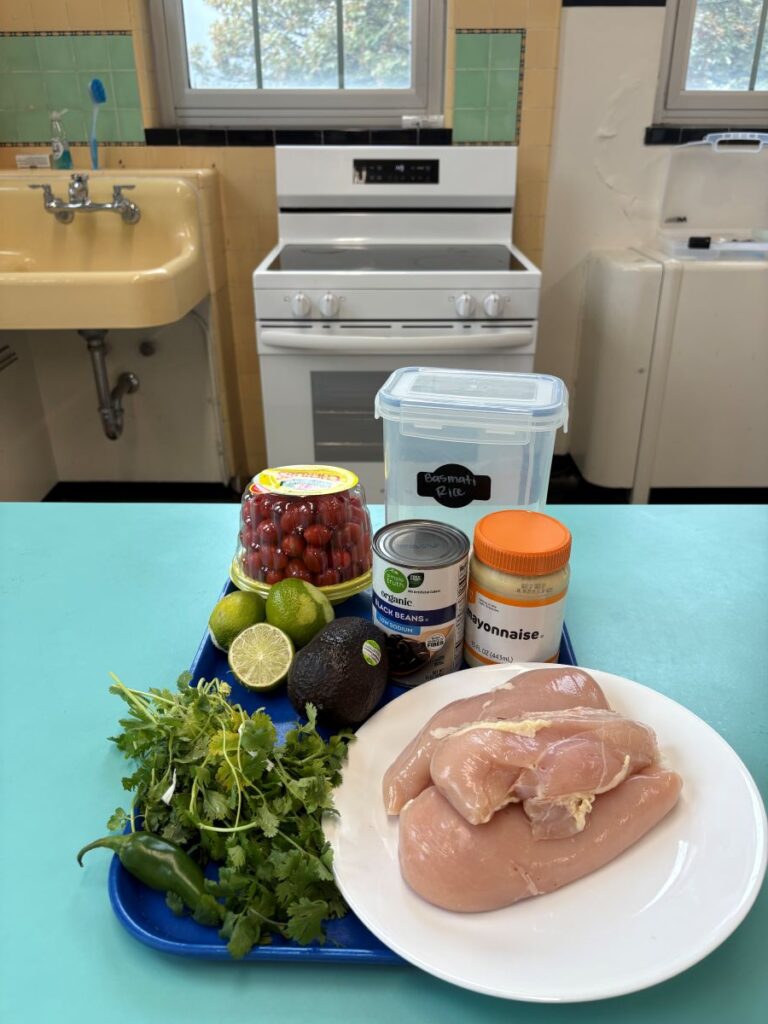 Your first step when cooking should always be to gather your ingredients and supplies. “Mise en place” is a French culinary term that means everything in its place. This is important when cooking, especially in college, to make sure you have all the ingredients you will need. For this recipe, you will need chicken breasts, basmati rice, black beans, corn, mayonnaise, cherry tomatoes, a bundle of cilantro, limes, an avocado, taco seasoning, as well as an assortment of spices. Once those ingredients are gathered, you are ready to get started!