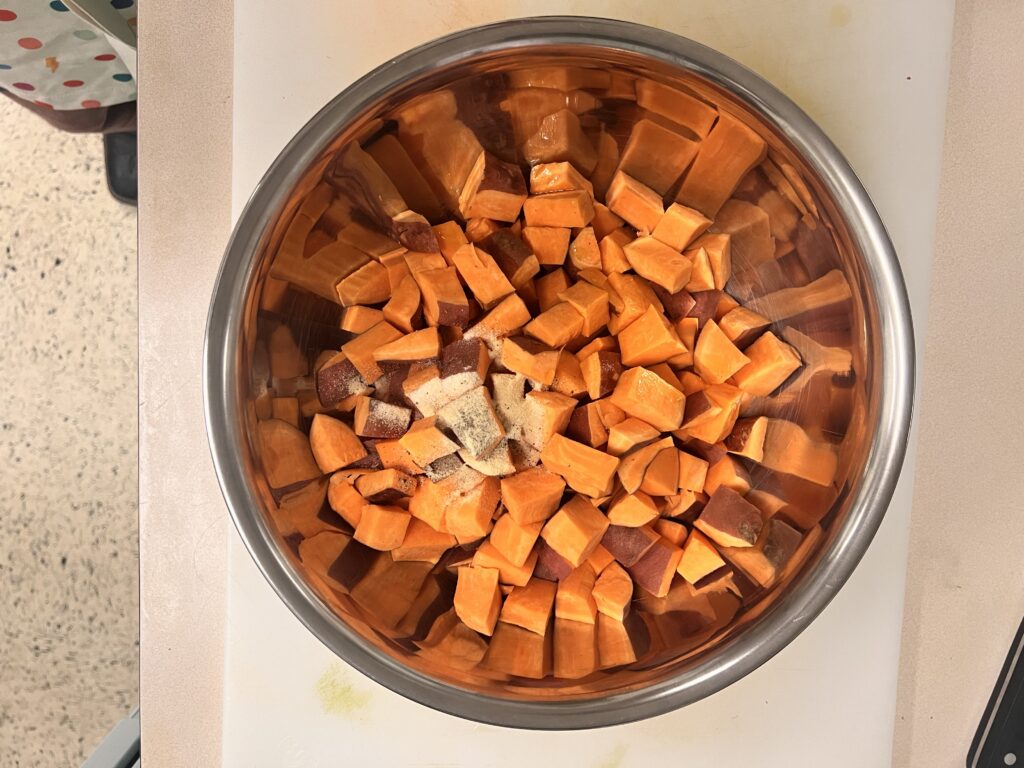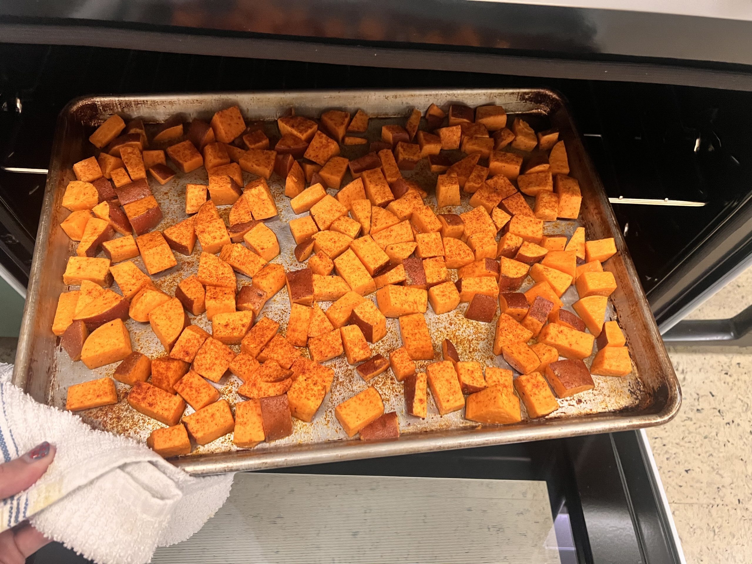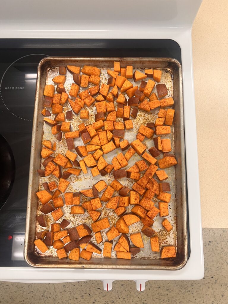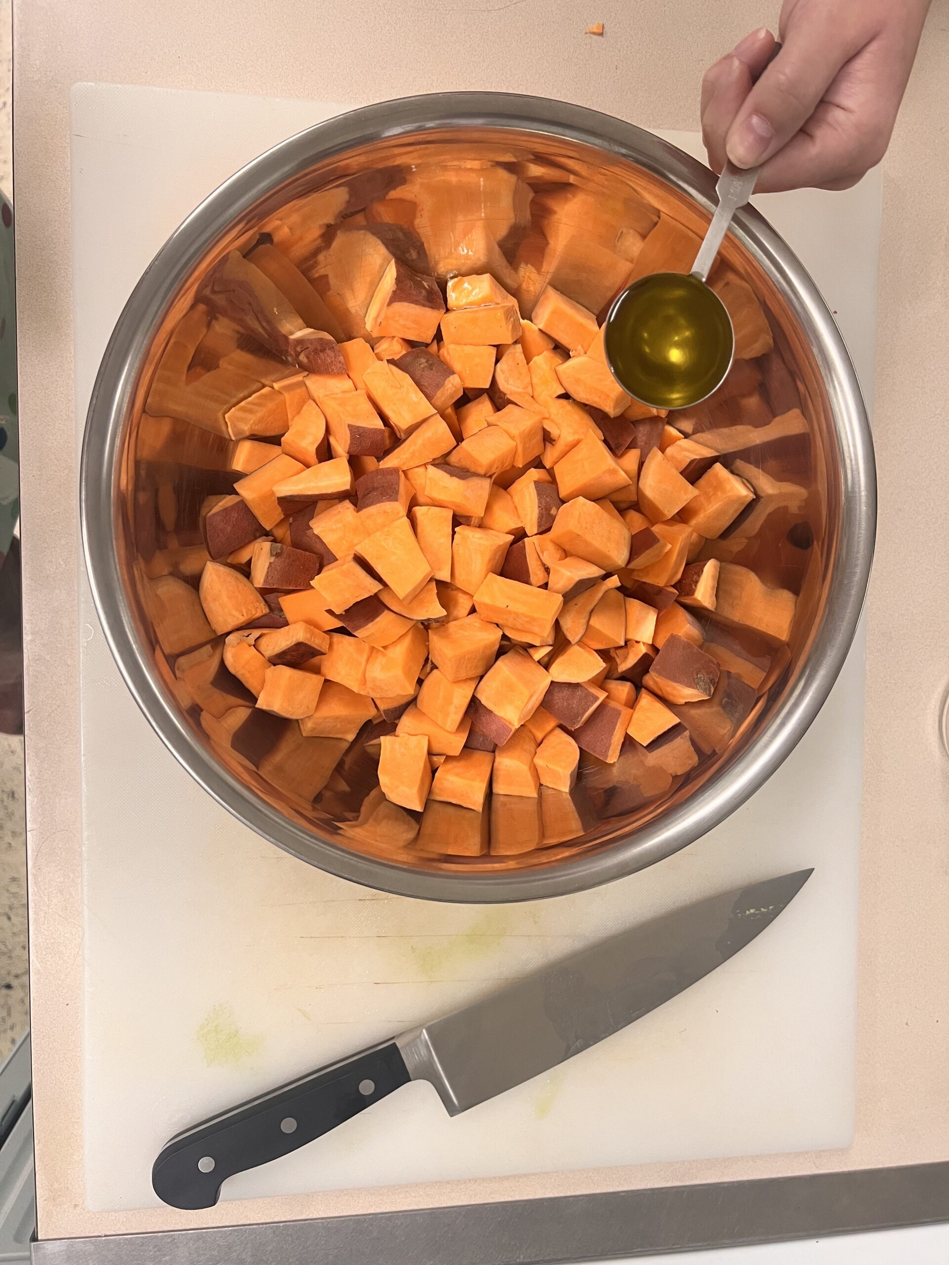 This recipe is super simple and is an example of baking as a form of food preparation. Baking is a dry heat cooking method that uses surrounding hot air to cook the food. This is generally in an oven. Baking is great because while your food is cooking, it doesn’t need constant attention.