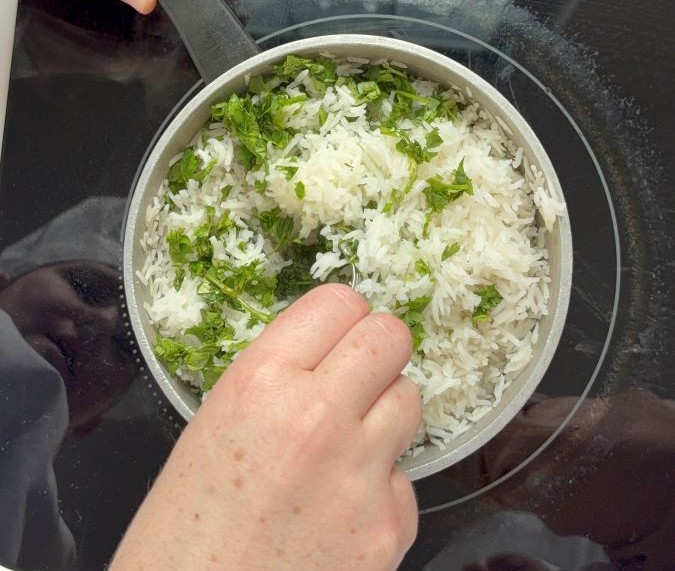 2. Remove rice from the heat and let cool slightly. Fluff the rice with a fork and stir in 1/2 cup roughly chopped cilantro, 2 Tbsp fresh lime juice, and 1 tsp olive oil.