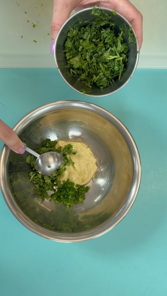 While the rice is cooking, or beforehand, prepare the aioli. Start by finely chopping the cilantro. Once chopped, set aside 1/2 cup for the cilantro lime rice, and add 2 Tbsp to a medium bowl. Mince the jalapeno, measure 1 Tbsp, and add to the bowl. Next, juice the limes. Measure and set aside 2 Tbsp for the rice, and add 1 1/2 tsp to the aioli. Lastly, add 1/8th tsp of garlic powder, 2 tsp of water, and 1/4 cup of mayo. Stir to combine. Season with salt and pepper to taste.