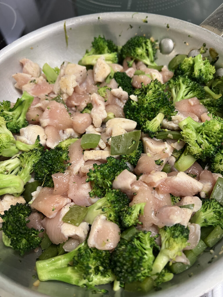 Next, in a large skillet, heat your oil over high heat. Cook your broccoli, bell pepper, and cloves of garlic for 5 minutes. Make sure to stir frequently until softened. Add in your chicken, tossing occasionally until it is golden brown and cooked through. Cooking the chicken will last about 8 minutes.